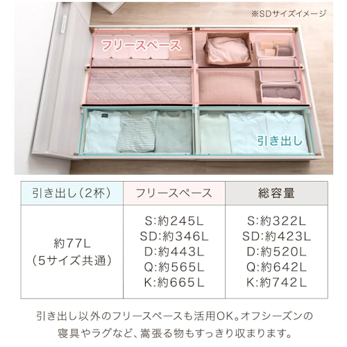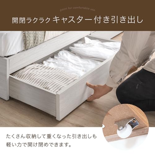 たとえばベッドなら、以下のように引き出しがついたタイプがおすすめ。たっぷり入るベッドを選べば、別で収納家具を用意する必要がありません。