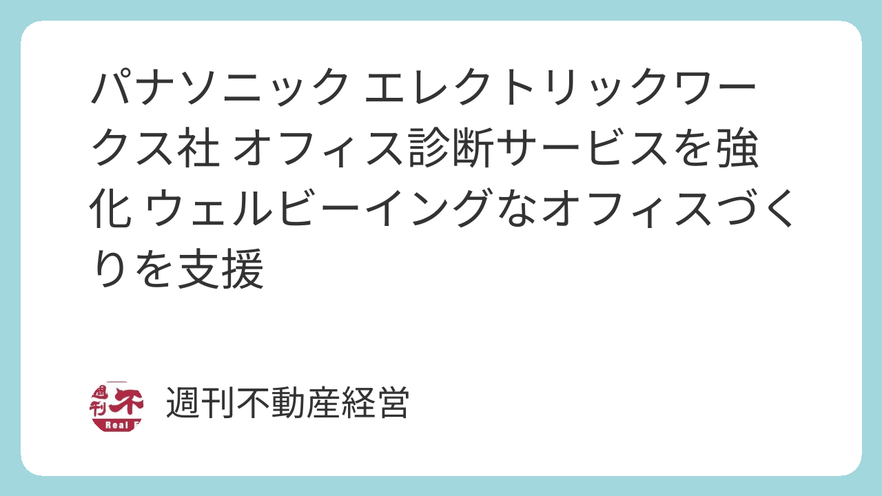 パナソニック(大阪府門真市)エレクトリックワークス社は、Well-Beingなオフィスづくりを継続的に支援する「オフィス診断レポートサービス」を今月から強化する。
