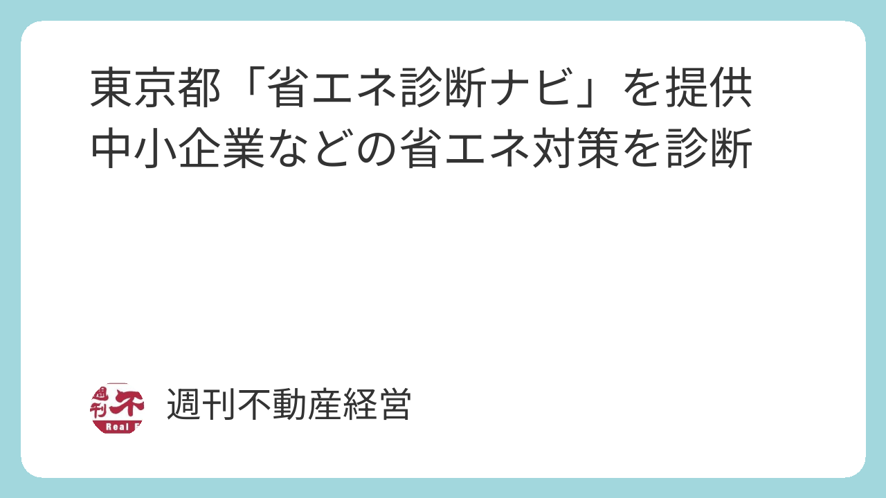東京都は8日から、中小企業などのさらなる省エネ化を推進するため、事業所のエネルギー使用状況や省エネ対策を診断できるツール「省エネ診断ナビ」の提供を開始した。公開場所は「クール・ネット東京」のウェブサイト。
