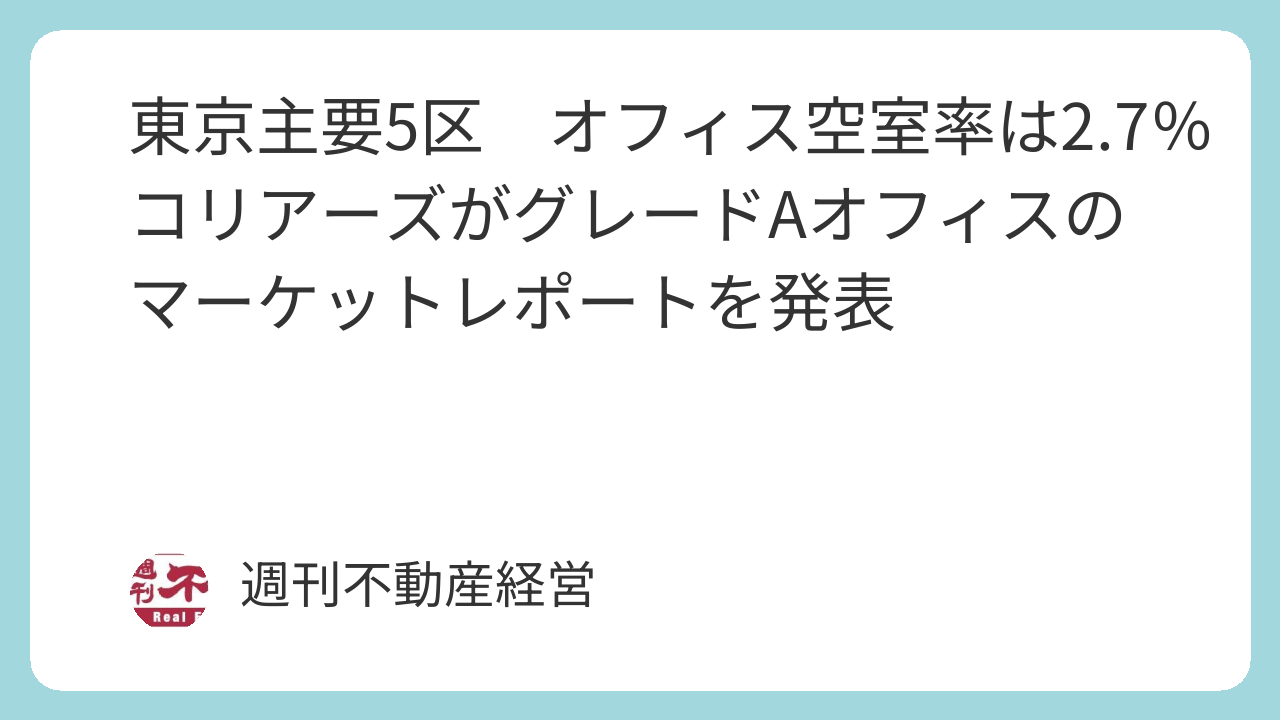 コリアーズ・インターナショナル・ジャパン(東京都千代田区)は、2024年10~12月期の東京ならびに大阪における主要オフィスエリアのグレードAオフィス(基準階面積概ね300坪以上の賃貸ビル)のマーケットレポートを作成。東京版は12日、大阪版は13日に公表した。