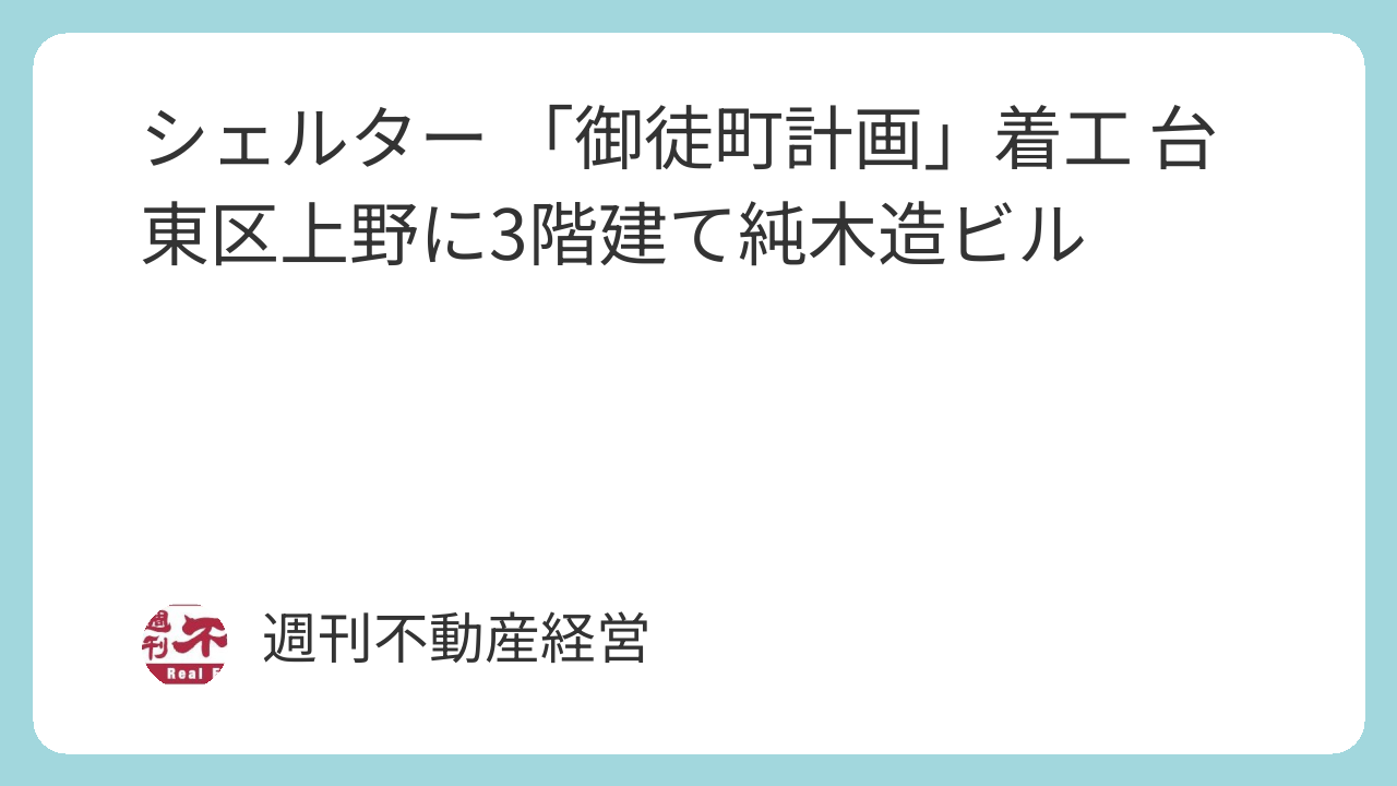 シェルター(山形県山形市)は、東京都台東区上野で「御徒町計画」に着工した。竣工は5月末の予定。