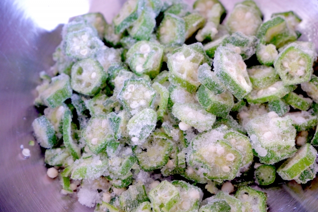 生のオクラを冷凍する場合は、オクラを塩揉みして洗い、水気をしっかり取ってからヘタの先端とその周囲の硬い部分(ガク)を切り取り、ラップに包みます。