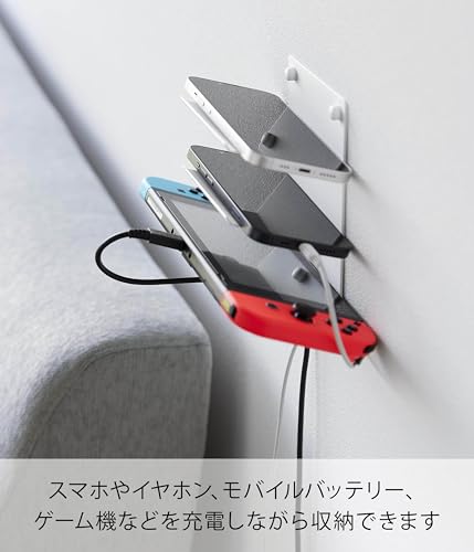 好みの位置に充電しながら収納できる3段ラックです。石こうボードピンで壁に簡単取り付け可能だということです。ホルダーがあるので、充電ケーブルの差し込み口を引っ掛けて収納でき、配線をまとめることができるそうです。