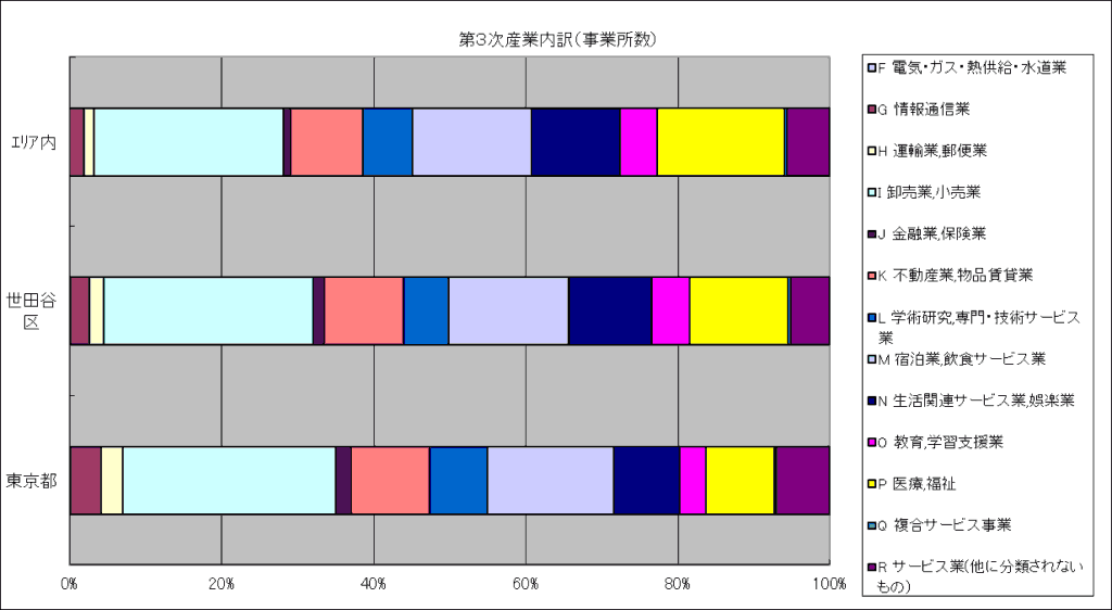 エリア内の産業別事業所数を見ると、製造業や建設業を含む「第2次産業」は1割弱。小売業やサービス業を含む「第3次産業」が大半を占め、東京都や世田谷区と比較しても第3次産業の比率が高めです。