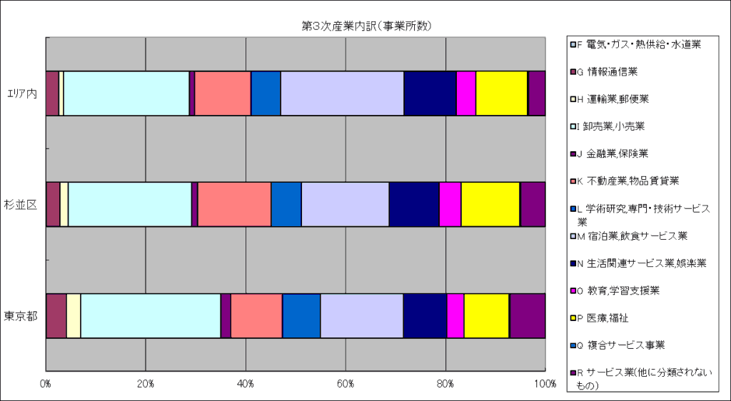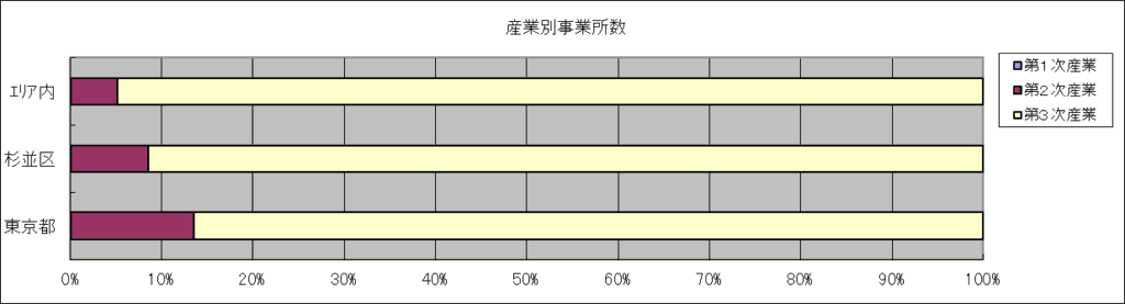 エリア内の産業別事業所数を見ると、製造業や建設業を含む「第2次産業」は1割未満。小売業やサービス業を含む「第3次産業」が大半を占め、東京都や杉並区と比較しても第3次産業の比率が高めです。