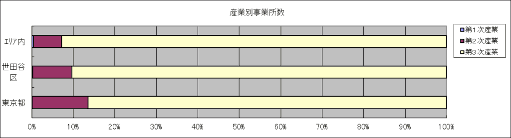 エリア内の産業別事業所数を見ると、製造業や建設業を含む「第2次産業」は1割弱。小売業やサービス業を含む「第3次産業」が大半を占め、東京都や世田谷区と比較しても第3次産業の比率が高めです。