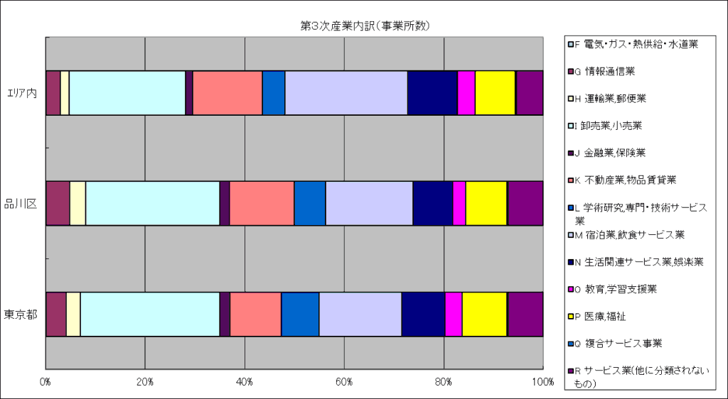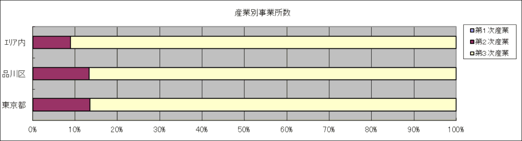 エリア内の産業別事業所数を見ると、製造業や建設業を含む「第2次産業」は1割弱。小売業やサービス業を含む「第3次産業」が大半を占め、東京都や品川区と比較しても第3次産業の比率が高めです。