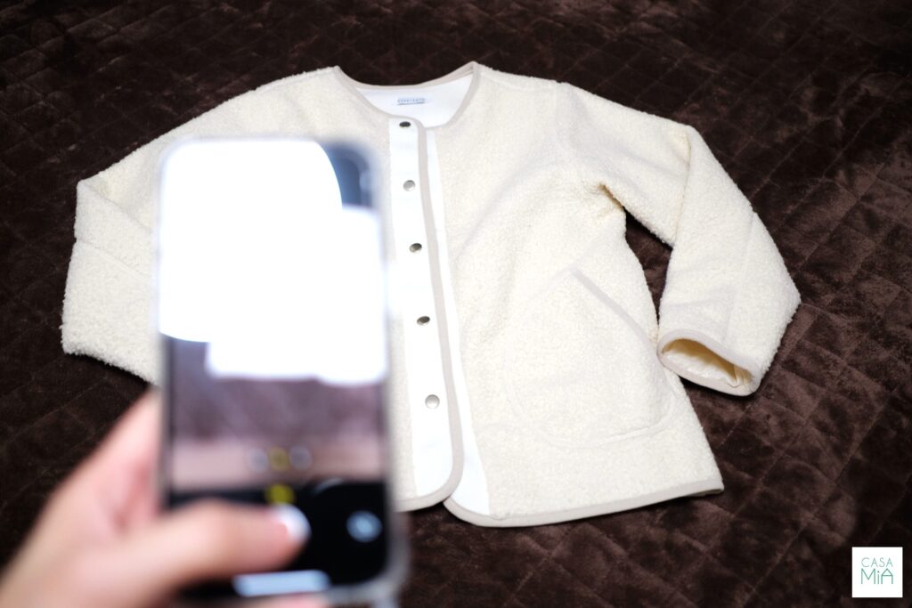 XZには撮影した洋服の背景を自動切り抜きしてくれる機能があり、これがとても便利…!ベッドの上に適当に置いた状態でも背景を白く加工してくれるので、撮影はサクサク進みました。