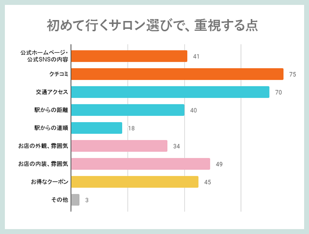 続いて「初めて行くサロンを選ぶ際、重視する点は?」を選択式(複数回答)でうかがったところ、現代らしく、「SNS等のクチコミ」を重視する人が7割超と、最も多い結果となりました。