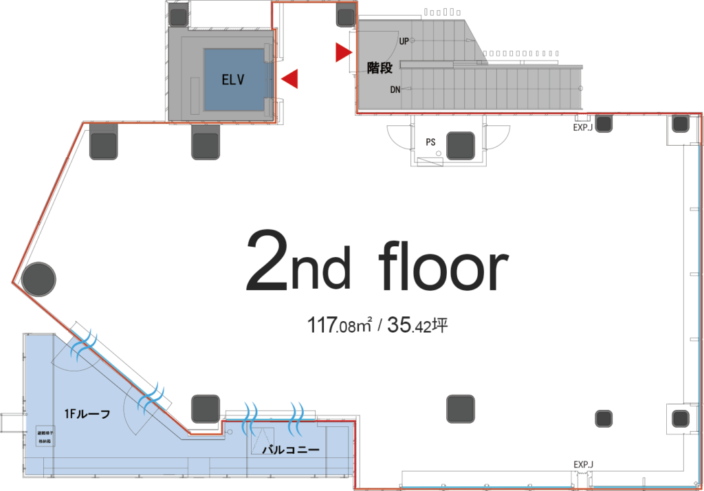 2階は117.08平米 / 35.42坪。エレベーターのほか、早稲田通りから直接階段で上ることもできるフロアとなっています。