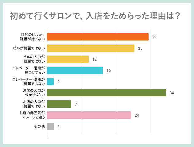 以上のアンケート結果からは、「交通アクセスの良い場所」かつ「分かりやすいビル」でサロンを開業することの重要性がうかがえます。
