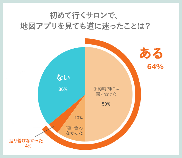 「初めて行くサロンで、地図アプリを見ても道に迷ったことがありますか?」という設問に対し「ある」と答えた方は、全体の64%となりました。