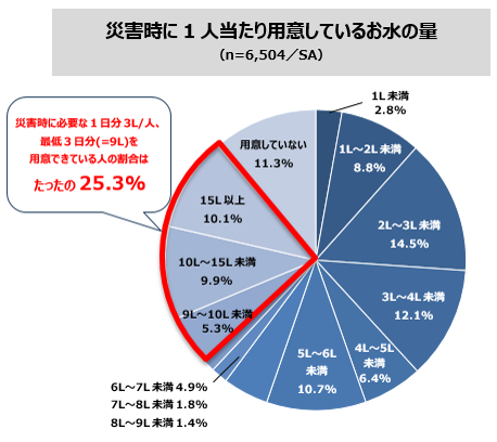 防災備蓄として飲料水(お水)を用意している人が80.9%いる一方、災害時に必要な1日3L/人 、最低3日分(=9L)の飲料水(お水)を用意できている人はたったの25.3%だったそうです。