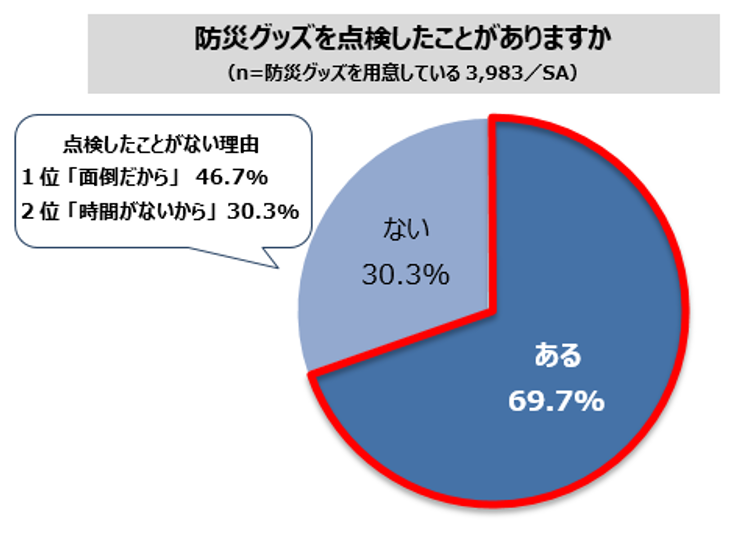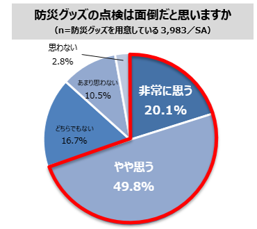 防災グッズを点検したことがある人は69.7%だそうです。 一方、69.9%以上の方が防災グッズを点検するのは面倒・大変だと思うと回答したということです。