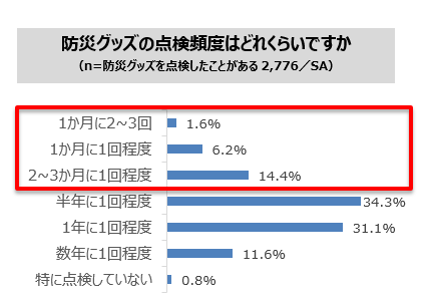 また防災グッズの点検は、年に4回おこなうことが推奨されていますが、年に4回程度点検ができている人の割合は22.2%という結果になったそうです。