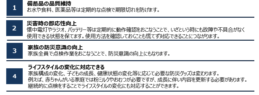 「防災グッズはただ備えておくだけでは十分ではありません。災害は予測できないタイミングで発生するため、継続的に点検し、常に最良の状態で維持することで、もしもの時に真の効果を発揮します。