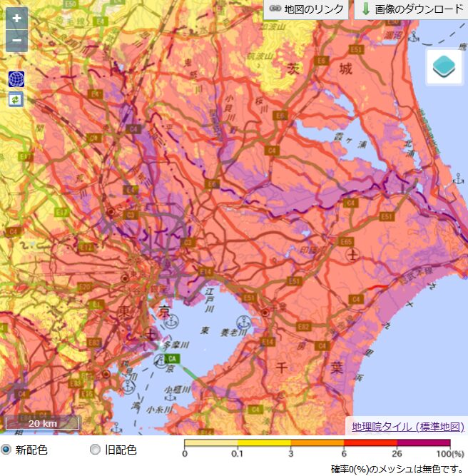 東京近郊全体の震度6強以上の確率を見ると、6~26%のエリアが広範囲に見られます。洗足駅周辺の原町の一部では、比較的高い確率が予測されているようです。
