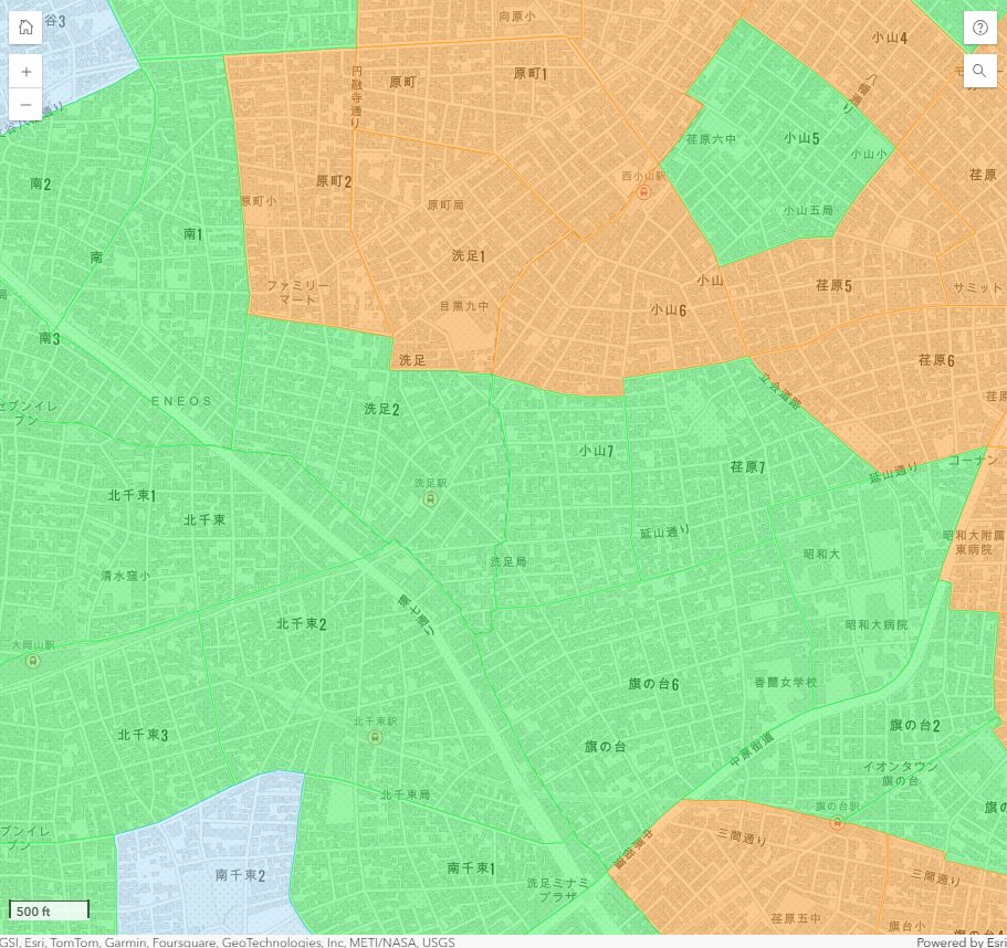 洗足駅周辺は、目黒区・大田区・品川区の3つの自治体にまたがるエリアです。