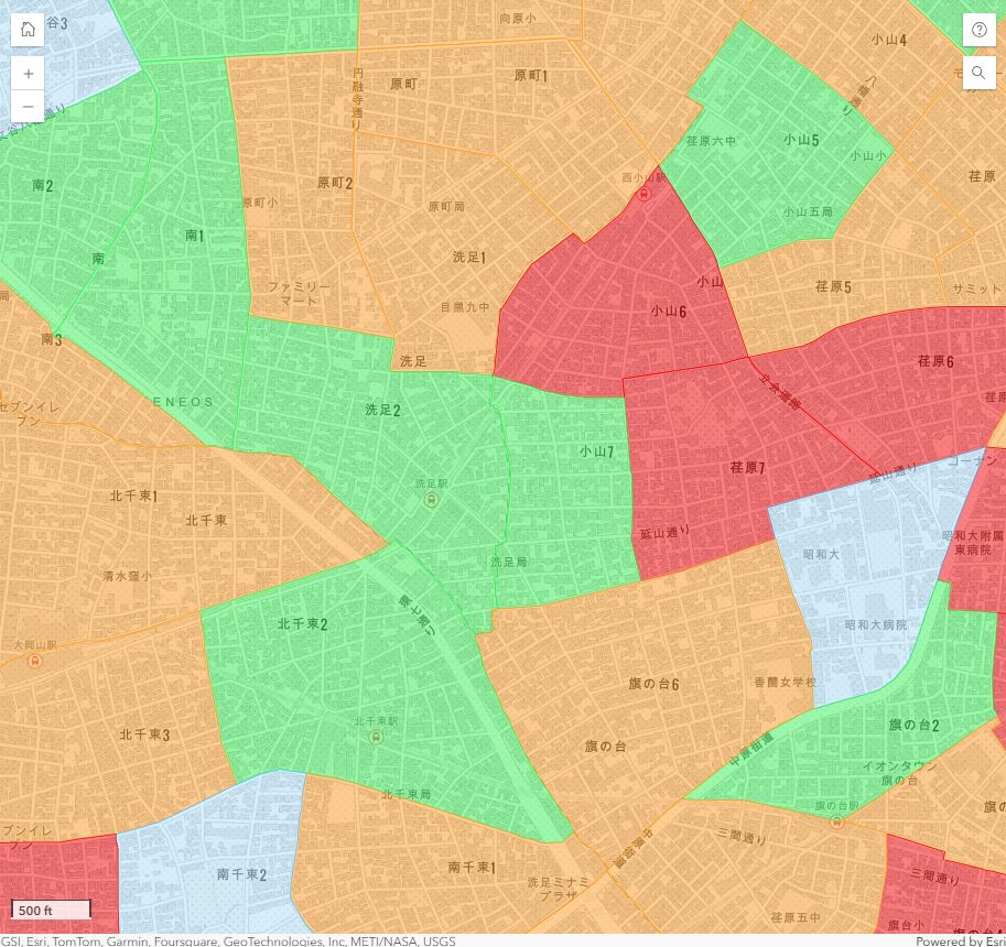 洗足駅周辺で最も高リスクとなるのは、ランク4の荏原6・7丁目と小山6丁目です。ランク4の地区は、東側エリアに集中していることがわかります。