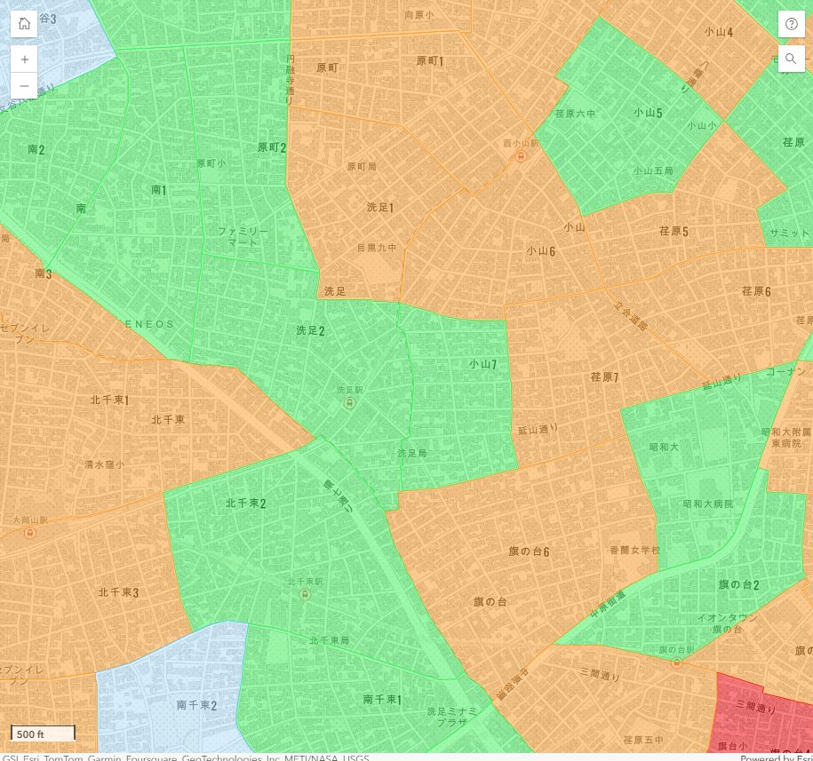 ランク3の地区が最も多く、洗足1丁目と原町1・2丁目、南3丁目、目黒本町5・6丁目、北千束1・3丁目、南千束1丁目、荏原5丁目、旗の台5・6丁目が該当しています。