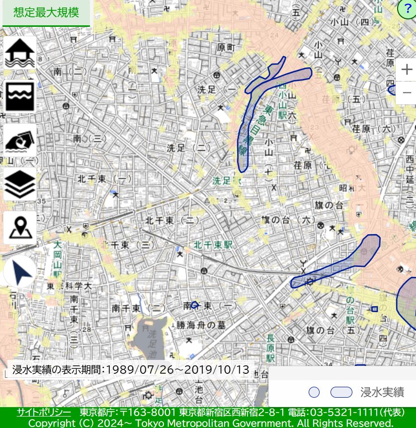 また、東京都が提供している「水害リスク情報システム」の浸水実績図でも、都内で発生した浸水被害を確認することができます。この実績図では、洗足駅周辺において平成11年と平成16年に発生した浸水被害が掲載されています。