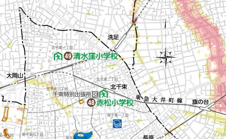 洗足駅周辺では、南千束2丁目の一部がイエローゾーンに指定されており、土砂災害への警戒が必要です。