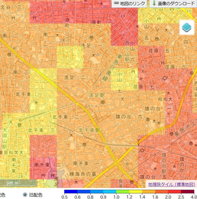 原町や洗足池付近では増幅率2.0~2.5との予想で、洗足駅周辺の中では最も揺れやすいとされています。
