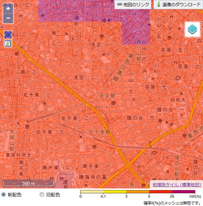 洗足駅周辺で震度6強以上の地震に見舞われる確率
