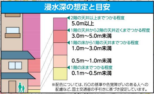 また水路から離れた場所にも、1.0m程度までの浸水が想定されている場所があります。