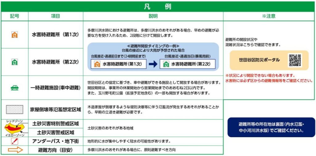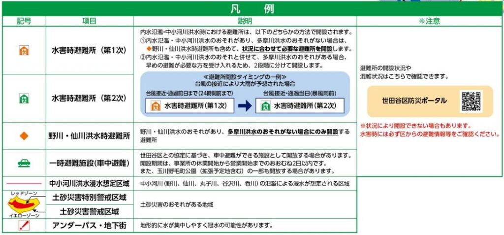 避難所は災害の状況に応じて開設されますので、世田谷区防災ポータルサイトや川崎市防災ポータルサイトなどでこまめに避難情報をチェックしましょう。