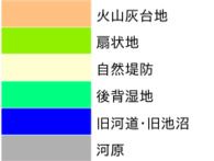二子玉川駅周辺は、複数の地盤が混在しているエリアです。「火山灰台地」と「扇状地」、「自然堤防」、「後背湿地」、「旧河道・旧池沼」、「河原」の6種類があります。