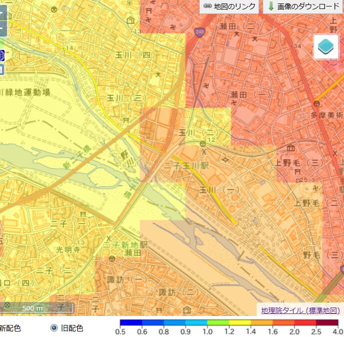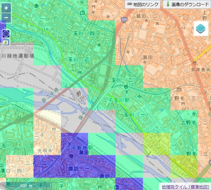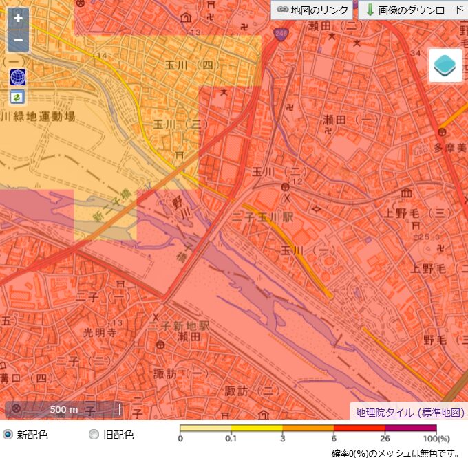 二子玉川駅周辺の地震リスク|全体的に低リスクの予想