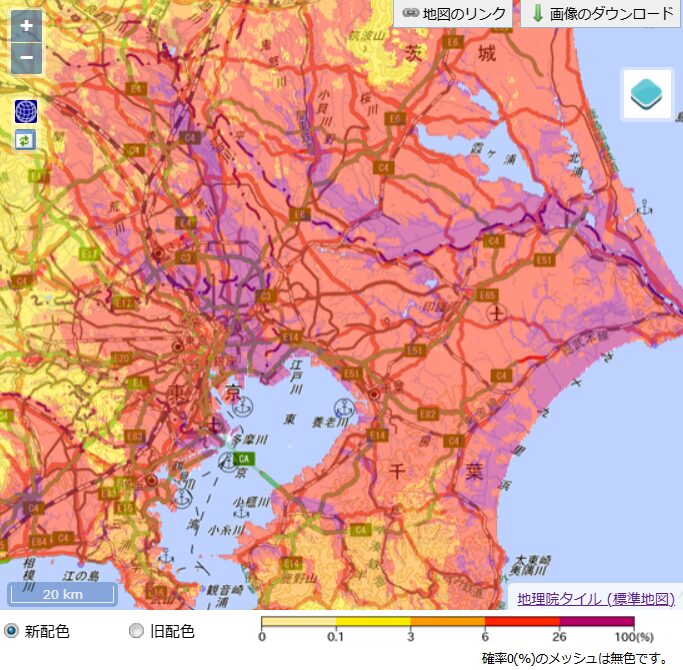 東京近郊全体を見ても、震度6強以上の揺れに見舞われる確率は6~26%のエリアが最も多くなっています。3~6%の玉川3・4丁目や鎌田1丁目付近は、東京近郊全体の中でも揺れにくいエリアのようです。
