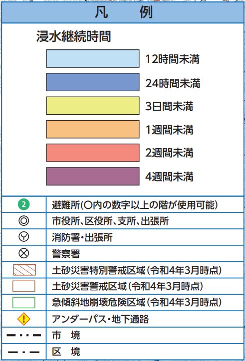 さらに、神奈川県川崎市が提供する多摩川氾濫に関するハザードマップには、最大浸水深を示した地図と、浸水が継続する時間を示した地図の2種類があります。