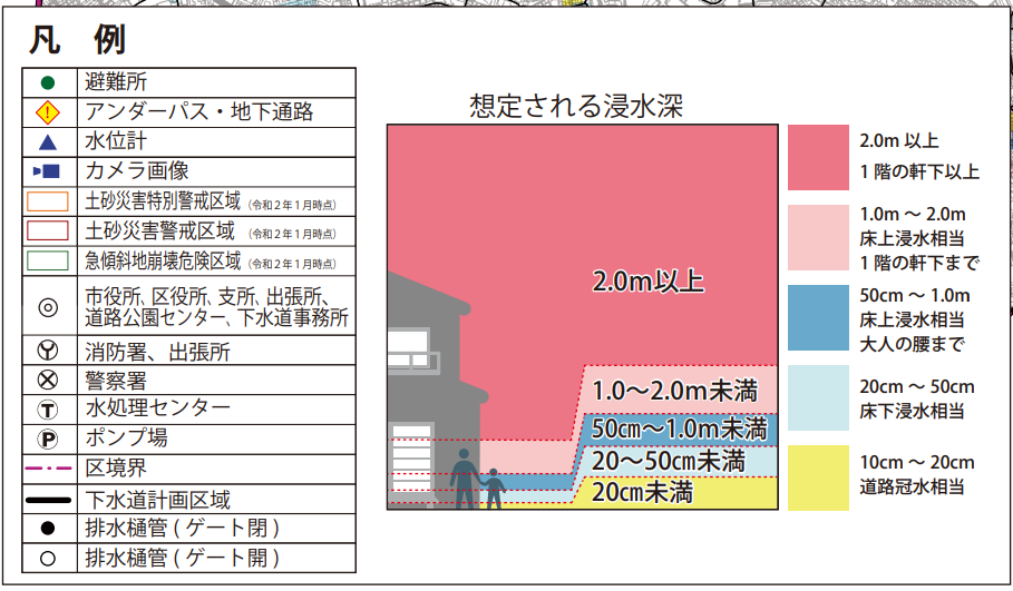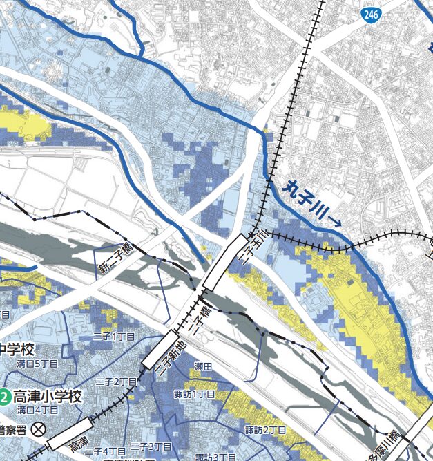多摩川の向かい、二子玉川駅周辺の川崎市高津区内では、諏訪2丁目で2.0m以上の浸水が想定されています。2.0mは、一般的な住宅の1階の軒先付近まで水が達する高さです。
