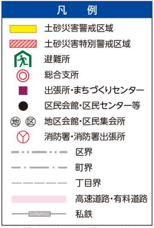 土砂災害には、急傾斜地の崩壊(がけ崩れ)・土石流・地すべりの3種類があります。二子玉川駅周辺の警戒区域はすべて急傾斜地の崩壊による土砂災害の警戒区域となっています。
