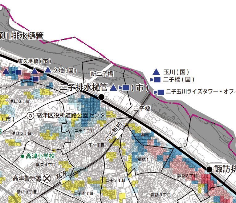 | 令和元年10月12~13日 | 台風19号(令和元年東日本台風) | 東京都世田谷区鎌田1 東京都世田谷区上野毛2 東京都世田谷区玉川4 神奈川県川崎市高津区諏訪1・2 神奈川県川崎市高津区二子1 神奈川県川崎市高津区瀬田 |