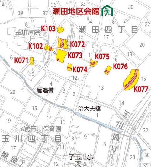 土砂災害時に避難可能な指定避難所は、瀬田4丁目にある「瀬田地区会館」です。二子玉川駅からは1km以上離れていますが、駅の東側にある「上野毛地区会館」(中町2丁目)も避難所に指定されています。また、水害時避難所にも指定されている瀬田2丁目の「瀬田中学校」も土砂災害における予備の避難所になっています。