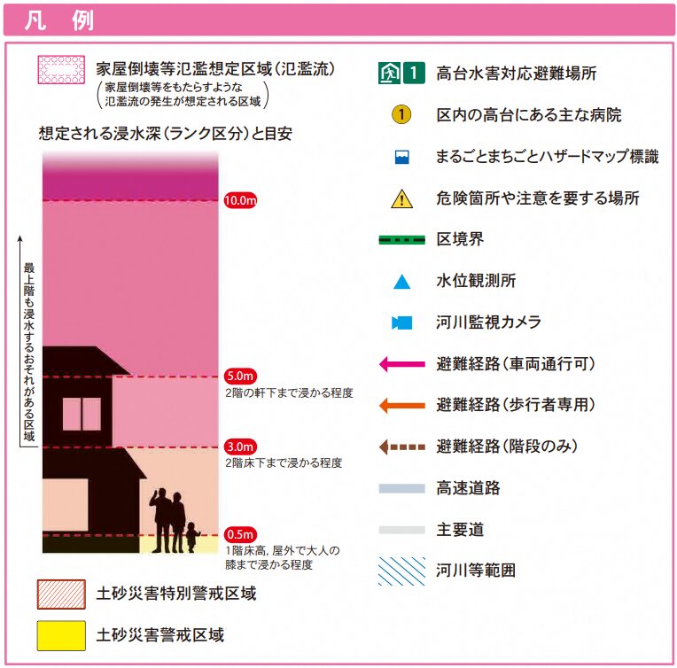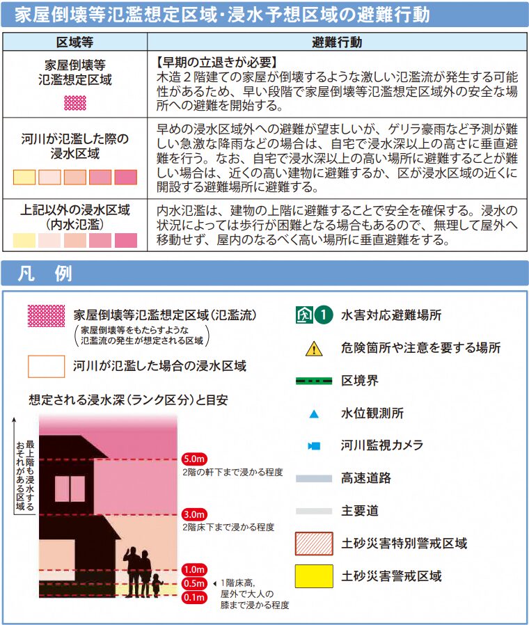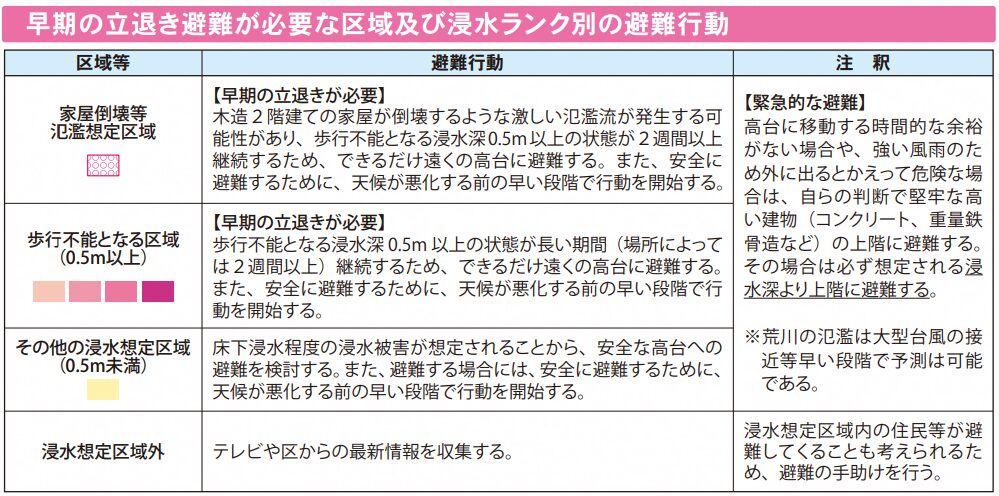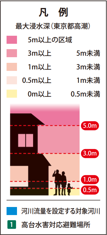 荒川や墨田川が氾濫した場合とは異なり、高台側でも浸水が想定されているので注意しましょう。