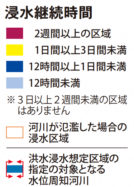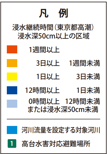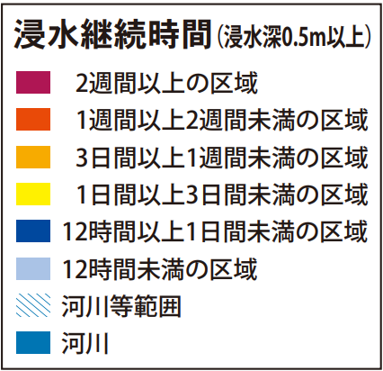浸水深が50cmを超える状態が続く時間については、ほとんどの地域で12時間未満とされていますが、石神井川沿いのごく一部では、2週間以上続く可能性もあります。