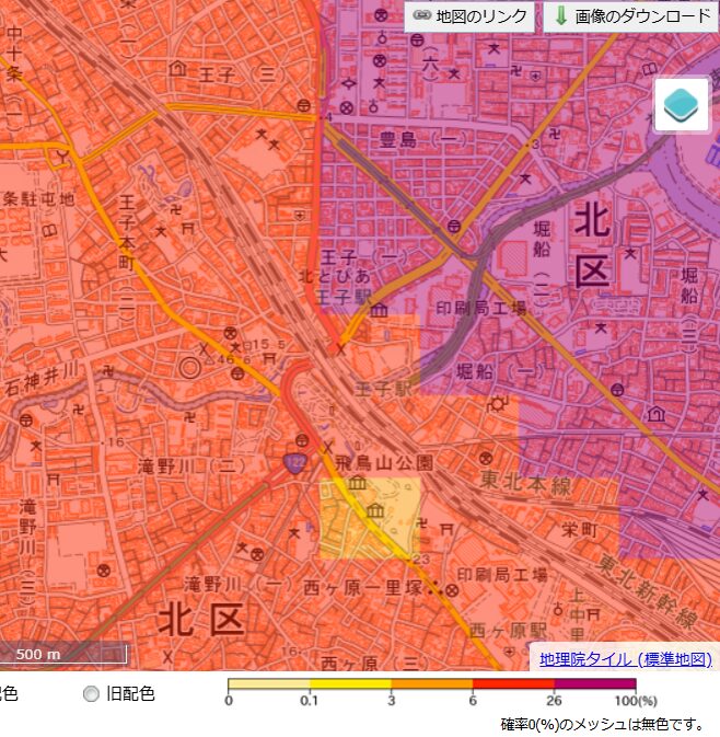 上の地図は、王子駅周辺における震度6強以上の揺れに見舞われる確率を色分けして表したものです。