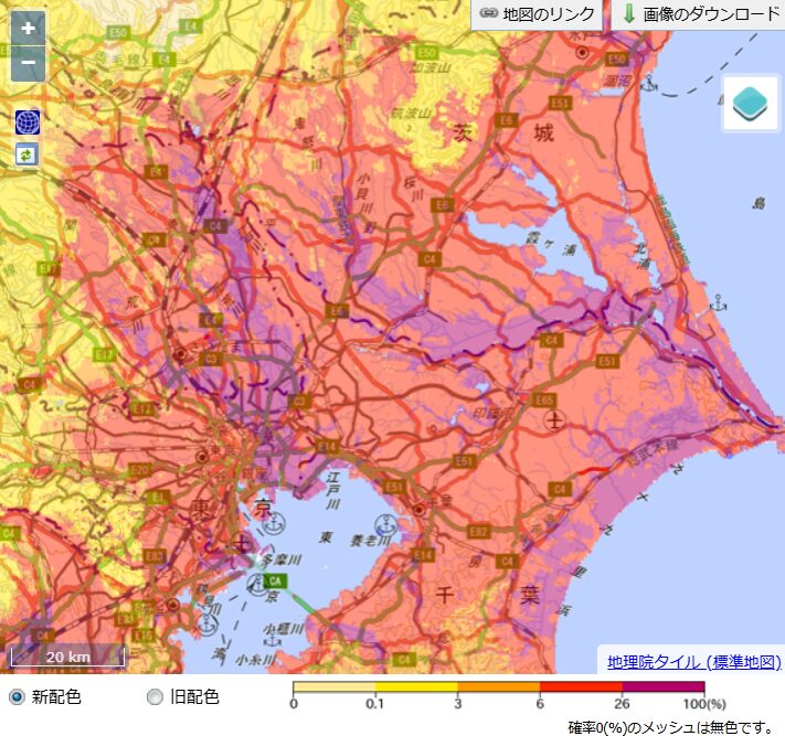 6~26%のエリアが広く見られますが、地震で揺れやすいとされている北東エリアでは26~100%と周囲よりも高確率となっています。