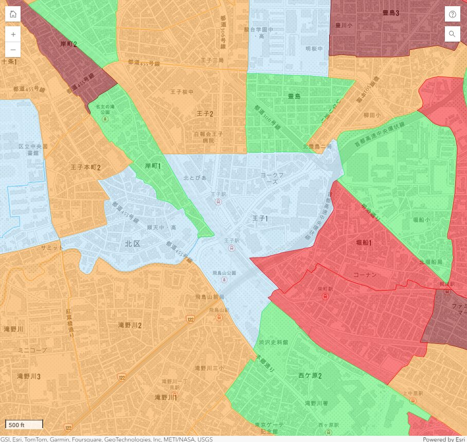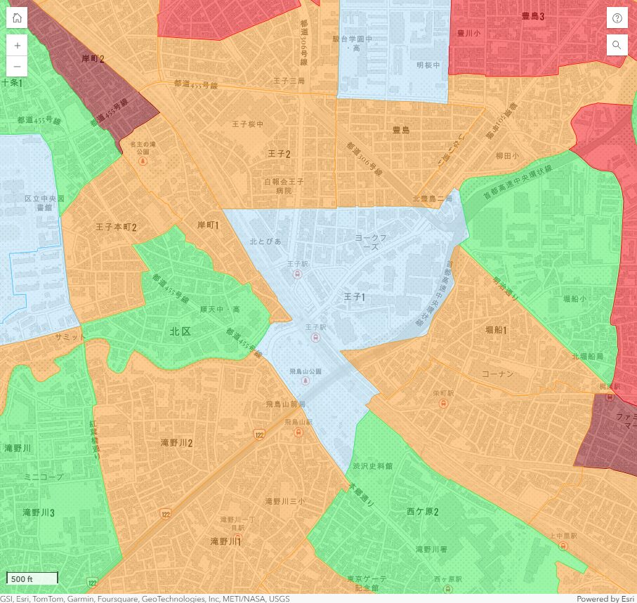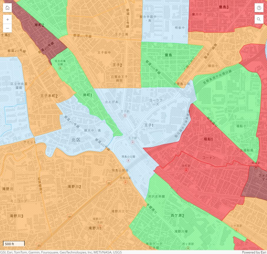 最も低リスクとなるランク1の地区は、王子1・6丁目と王子本町1・3丁目です。