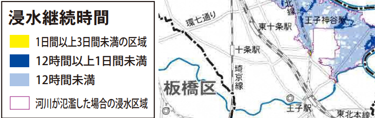 王子駅周辺の低地エリアは、隅田川や荒川の氾濫による浸水も想定されています。荒川の氾濫による浸水想定では、深いところで5.0mとなっています。50㎝以上の浸水継続時間は、最長で2週間以上続く場所があります。石神井川や隅田川が氾濫した場合にも、3.0m程度までの浸水が想定されています。