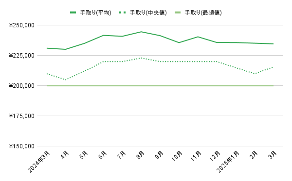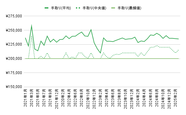 「新卒の月給が30万」とも言われる状況ですが、当ツール利用者においてはあまり影響を受けていないようでした。それでも全体的に見れば、僅かずつ手取りが増えていると言えそうです。