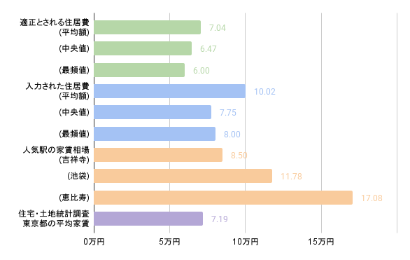 一方、入力された住居費は、平均額・中央値・最頻値ともに東京都の平均家賃を上回りました。人気駅の家賃相場との乖離も少なく、より現実的な数字となっていることがうかがえます。