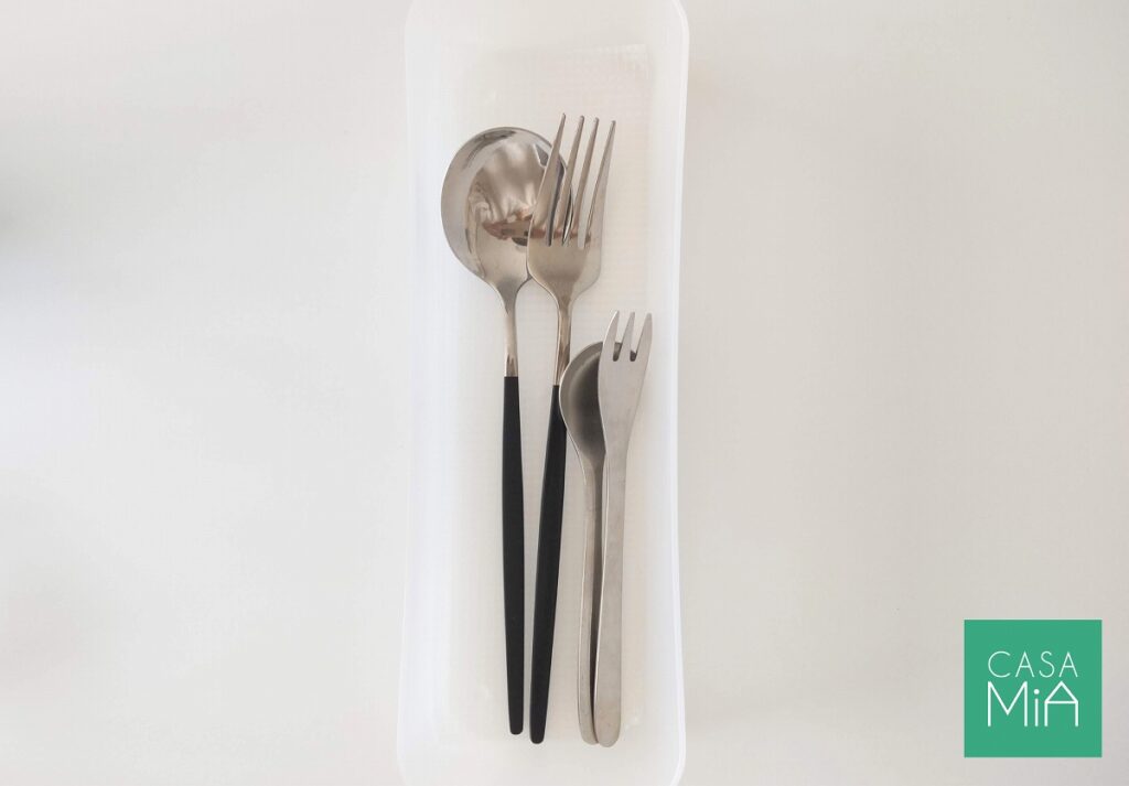 カトラリーや箸置き、豆皿といった細かいものは、上の画像のように、トレーを使ってジャンルやサイズごとに分けると、見た目がすっきりするだけでなく、使いやすさもアップします。