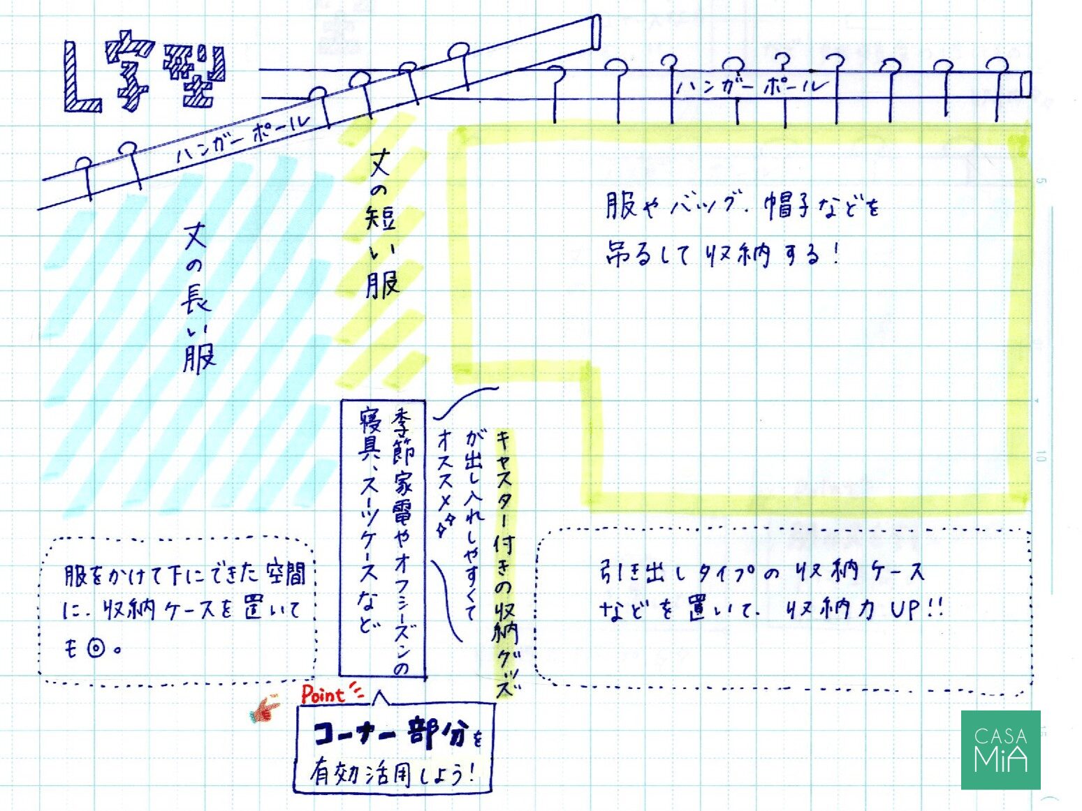 L字型のウォークインクローゼットは、上の画像のように、デッドスペースになりやすいコーナー部分を有効活用するのがコツです。