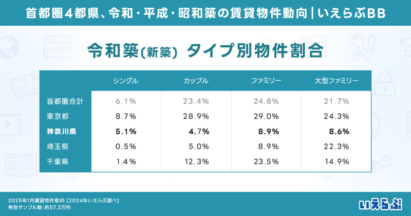 また、令和築の物件についてもシングルタイプでは東京に次いで5.1%と多いものの、その他のタイプでは4県中最も少ない結果となったそうです。