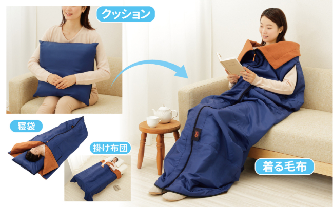 アルミシート内蔵のとても暖かい寝袋です。着る毛布や掛け布団、コンパクトにたたむとクッションにも変身するそうです。
